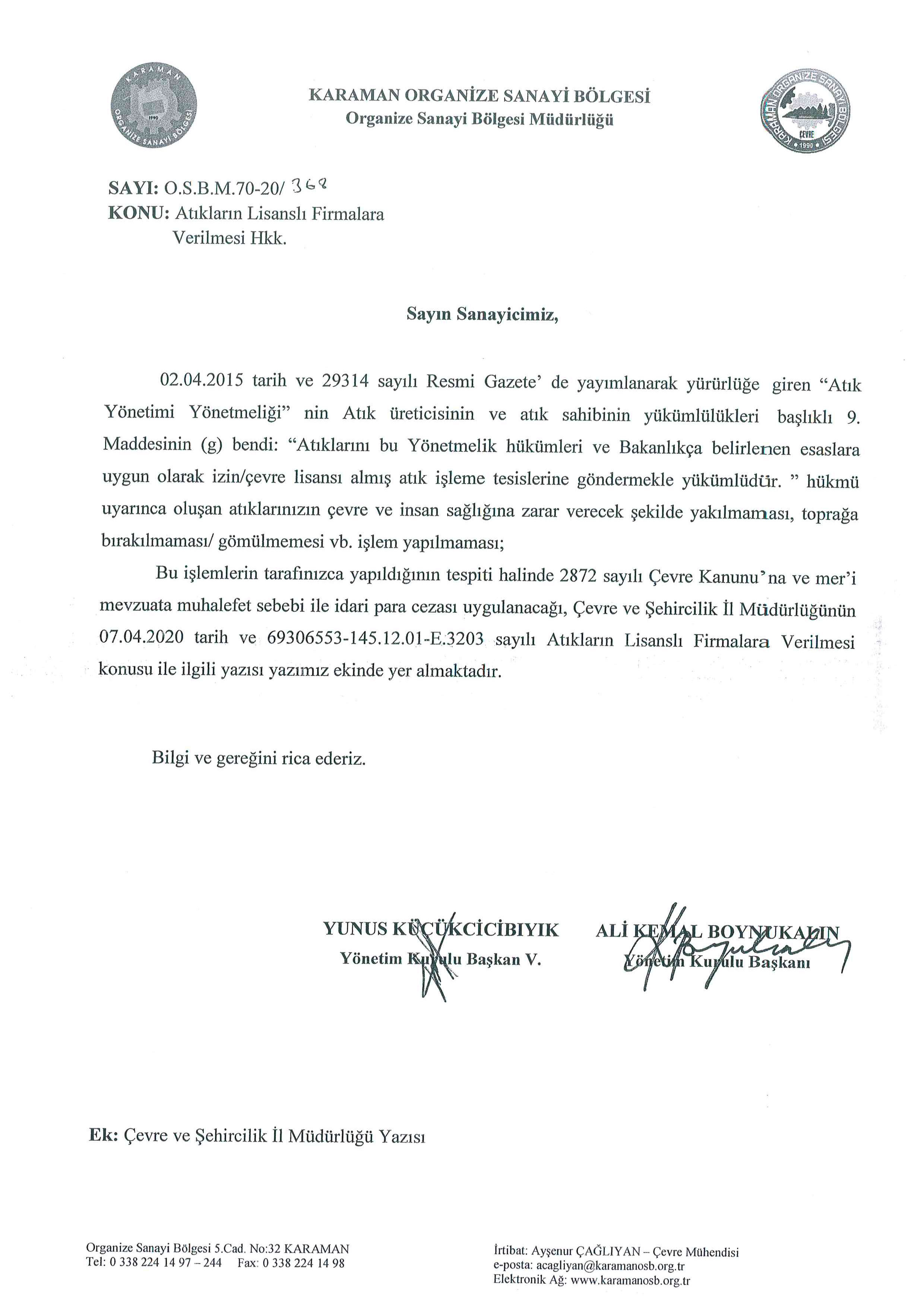 KARAMAN OSB YÖNETİMİNDEN BELEDİYE BAŞKANLIĞINA TEŞEKKÜR